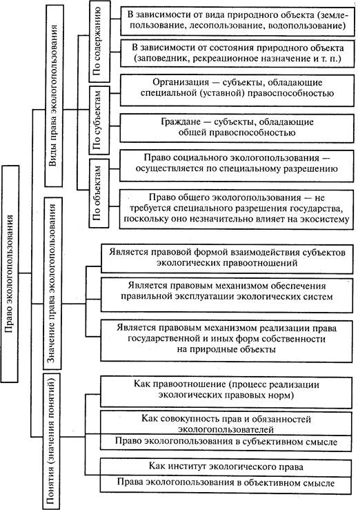 Различают бессрочное пользование природными объектами, то есть пользование без заранее установленного срока, и временное пользование. Понятие и содержание права экологопользования приведены на рис. 1 и 2.(1)