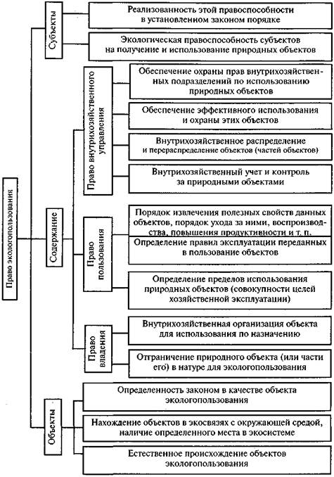 Содержание права экологопользования включает наличие нескольких правомочий: права собственности, права владения, права пользования и права внутрихозяйственного управления природным объектом, предоставленным в пользование, владение, собственность или аренду.