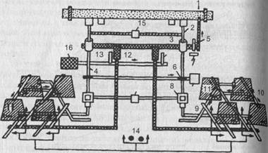 1 — мостовой грейферный кран; 2 — пластичный питатель; 3 — барабанный грохот; 4 — ленточный конвейер; 5 — сепаратор электрический подвесной; 6 — конвейер для металлических банок; 7 — пакетировочный пресс; 8 — молотковая дробилка; 9 — элеваторный подъемник; 10 — система реверсивных ленточных конвейеров; 11 — биотермические башни со шнековы-ми механизмами; 12 — резонансный виброгрохот; 13 — конвейер компоста; 14 — воздуходувка; 15 — аспирационная установка; 16 — склад компоста; 17 — бункер металлических