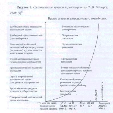 Экологический кризис - это обратимое изменение равновесного состояния природных комплексов. Он характеризуется не только усилением воздействия человека на природу, сколько резким увеличением влияния измененной людьми природы на общественное развитие. Известен ряд экологических кризисов: относительного объединения доступных примитивному человеку ресурсов промысла и собирательства, обусловивший стихийные биотехнические мероприятия типа выжигания растительности для ее лучшего и более раннего роста, перепромысла крупных позвоночных животных, современный кризис глобального загрязнения, которому, по мнению ученых, соответствует высший этап научно-технической революции. Человек выступает при экологическом кризисе активно действующей стороной. История цивилизации доказывает, что вслед за экологическим кризисом следует революционное изменение во взаимоотношениях общества и природы.