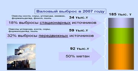 Анализ состава выбросов в атмосферу свидетельствует, что в 2007 году по сравнению с 2000 годом снизились выбросы оксида углерода (на 12 %), диоксида серы (на 44 %) и пыли (на 37 %), однако при этом возросли выбросы соединений азота (на 48 %).