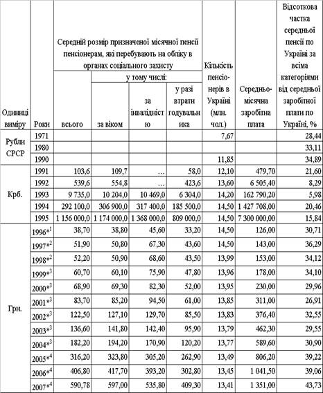 Чисельність пенсіонерів, середній розмір пенсії та заробітної плати в Україні у 1971 – 2007 роках