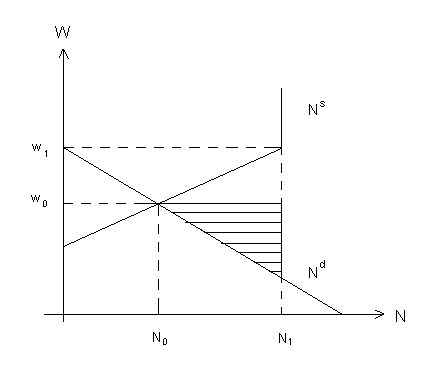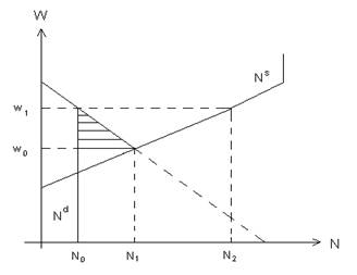 С позиции классической школы в данном случае цена труда завышена на величину (W0 –W1). Но даже при снижении ее до W1 сохранится безработица в размере (N1 –N0), которая не устраняется в ходе стихийного взаимодействия спроса и предложения на рынке труда. В данном случае рынок труда стабилизируется при неэффективном уровне занятости, так как предельная производительность труда превышает предельные издержки на него. Площадь заштрихованного треугольника рис. 1.2 представляет чистый выигрыш от увеличения производства путем доведения занятости до N1(6).