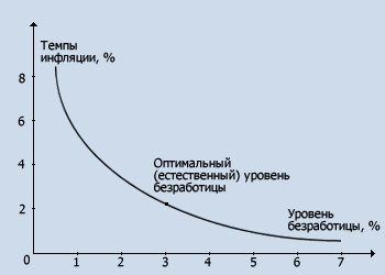 Эмпирические исследования показали, что между безработицей и инфляцией существует обратная зависимость. Эти исследования обобщил британский экономист А.У.Филлипе (1958). Он доказал, что между уровнем безработицы в стране и темпами роста цен наблюдается обратно пропорциональная зависимость (ранее эту закономерность подметили американские ученые П.Самуэльсон и Р.Солоу). На графике связь уровня безработицы и темпов инфляции изображается в виде кривой Филлипса.