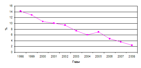 По данным Территориального органа Федеральной службы государственной статистики по Республике Мордовия, в 2008 году численность экономически активного населения составила 474,4 тыс. человек, из них 463,0 тыс. человек (97,6%) были заняты в экономике (Приложение А). Занимались поиском работы и в соответствии с методологией Международной организации труда классифицировались как безработные 11,4 тыс. человек. Численность официально зарегистрированных безработных в 2008 году находилась в пределах 5,2 тыс. человек (45,6 % от общего числа безработных). Динамика уровня безработицы по методологии МОТ представлена на рисунке 1.