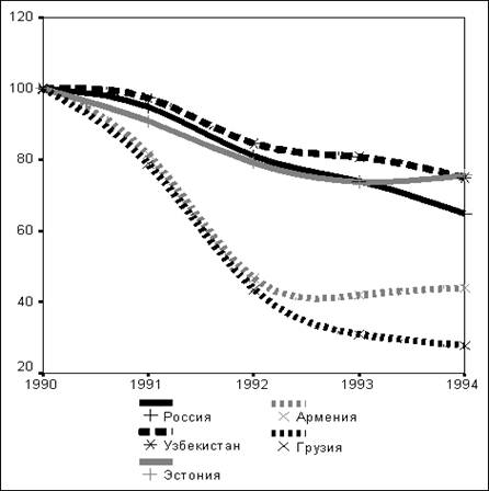Рис.1. Динамика производства ВВП на душу населения в Эстонии, России, Грузии, Армении и Узбекистане в 1990-1994 гг. (Производство ВВП в1990 г. = 100) Источник: Maddison 2001: 341.
