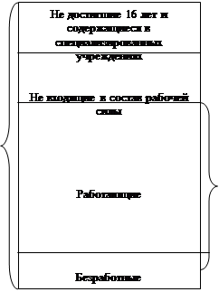 Определение уровня безработицы при полной занятости осложняется тем, что на практике трудно установить фактический уровень безработицы. Как правило, все население делится на три большие группы (см. рис. 1): первая группа включает в себя тех, кто содержится в специализированных учреждениях, например в психиатрических больницах или в исправительных заведениях. Эта категория людей не рассматривается в качестве потенциального компонента рабочей силы; вторая группа, которая называется "не входящие в состав рабочей силы", составляют взрослые, потенциально имеющие возможность работать, но по тем или иным причинам- надомная занятость, учеба, выход на пенсию- не работающие и не ищущие работу; третья группа- это собственно рабочая сила, численность которой составляет в среднем 50% всего населения. Эта категория охватывает всех тех, кто способен и готов работать. Считается, что в состав рабочей силы входят как работающие (занятые), так и безработные, но активно ищущие работу.