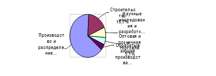 Также как и в обороте, наибольший удельный вес в объеме отгруженных товаров собственного производства составляет производство и распределение электроэнергии, газа и воды – 63,6 %, строительство – 17,4 %, научные исследования и разработки – 7,5 %, обрабатывающие производства – 4,4 %.