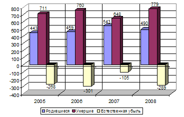 Естественная убыль населения составила 289 человек (в 2007 г. – 105 человек).