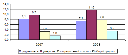 Демографическая ситуация в течение 2008 года характеризовалась продолжающимся процессом естественной убыли населения, связанной с низкой рождаемостью и старением населения.