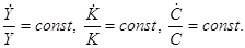 Равенство (3) представляет собой основную гипотезу модели Солоу (Solow, 1956). Равенство (4) – это один из пяти стилизованных фактов экономического роста, сформулированных Кальдором (Kaldor, 1961), этот факт входит в явном виде в формулировку AK-модели (Frankel, 1962). Равенство