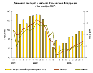 В январе-сентябре 2009г. внешнеторговый оборот России составил, по данным Банка России, 339,8 млрд.долларов США (57,4% к январю-сентябрю 2008г.), в том числе экспорт - 208,2 млрд.долларов (55,7%), импорт - 131,5 млрд.долларов (60,2%). Сальдо торгового баланса оставалось положительным, 76,7 млрд.доларов США (в январе-сентябре 2008г. - 155,0 млрд.долларов).