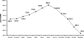 Ежемесячная динамика экспорта в январе-декабре 2008 года свидетельствует, что наращивание объемов экспорта происходило с 34,3 млрд.долл. в январе до 47,0 млрд.долл. в июле (см.рис.1). Однако, начиная с августа с ухудшением внешнеэкономической конъюнктуры на мировых товарных рынках и снижением мировых цен на нефть и нефтепродукты стоимостные объемы российского экспорта стали сокращаться с 45,4 млрд.долл.США в августе до 28,2 млрд.долл.США в декабре.
