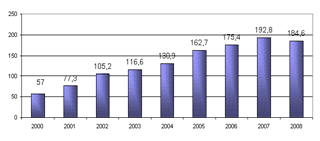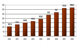 Рис. 3.1. Обсяги виробництва пива в Україні за 2000-2008рр. (млн.дал)