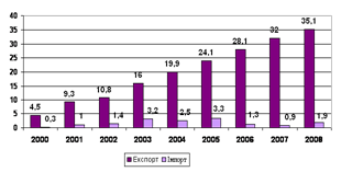 Рис.3.3. Експорт-імпорт пива в Україні за 2000-2008 рр. (млн.дал)