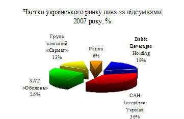 За підсумками 2007 року 94% ринку, припало на ЗАТ «Оболонь» (26,2%), групу компаній «Сармат» (13,2%), компанію «САН Інтербрю Україна» (35,8%) і Baltіс Beverаges Holdіng (18,8%) (3).