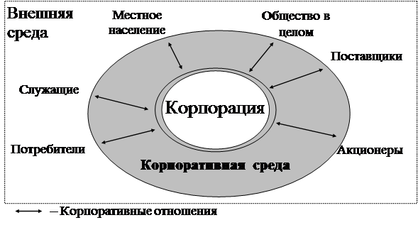 Акционеры вступают с корпорацией в особые отношения: они делают возможным само существование корпорации как поставщики "рискового" капитала, необходимого для ее возникновения, развития и роста. Интересы акционеров должны учитываться во всех важнейших действиях общества. То есть, корпоративная среда представляет собой область взаимодействия корпорации как объекта с теми, на кого она может в силу своих возможностей оказывать влияние (рис. 1.1).