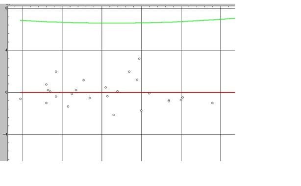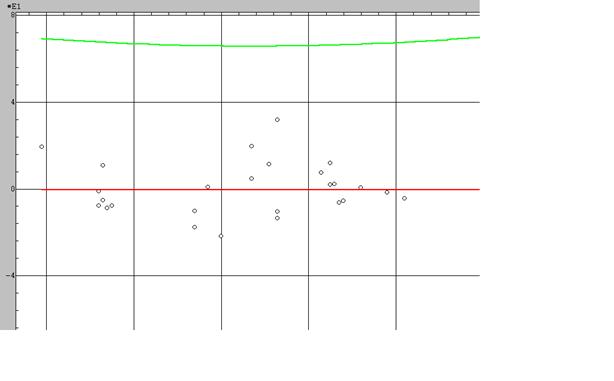 tb0 ->-tкр tb3 tb1 < tкр tb4 < tкр tb2 < tкр tb5 < tкр Среди всех коэффициентов значимыми являются b0, по такой модели прогноз сделать не представляется возможным, поскольку все коэффициенты регрессии при переменных не значимы. На этом регрессионный анализ можно завершить, так как значимых переменных не обнаружено. 2. Проанализировать матрицу парных коэффициентов корреляции на наличие мультиколинеарности, если мультиколлинеарность присутствует устранить методом пошагового отбора переменных, отобрать наиболее информативные переменные и с помощью них построить модель регрессии, оценить ее значимость. Коэффициент ковариации нормированных случайных величин называется коэффициентом корреляции, или коэффициентом парной корреляции. где Для удобства расчета корреляционной матрицы, предварительно рассчитывают ковариационную матрицу . Ковариационная матрица определяется как математическое ожидание произведения центрированного случайного вектора на этот транспонированный вектор Матрица где Рассмотрим матрицу исходных данных (см. Приложение 1) 1. Найдем центрированную матрицу Найдем оценку вектора где Используя пакет STADIA (Раздел описательная статистика), получаем вектор Согласно приведенной формуле 2. Рассчитываем матрицу Используя пакет STADIA (меню преобразований), получаем: Оценку ковариационной матрицы получим путем умножения матрицы Обозначим оценку ковариационной матрицы S, используя пакет MathCad находим: оценка ковариационной матрицы. Для расчета ковариационной матрицы воспользуемся формулой (1) и определением ковариационной матрицы (2), получаем следующую оценку корреляционной матрицы: Данный расчет можно провести на прямую, используя пакет STADIA, но наша цель бала показать весь процесс расчета корреляционной матрицы. Проанализируем корреляционную матрицу. 1 – я строка и 1 – столбец это признак у , как видим наибольшая связь наблюдается между признаками х7 и х14 очень тесная (-0,938) , если анализировать парную связь между факторными признаками, то можно заметить наибольшую связь между признаком х5 и х17 (-0,938). Устранение мультиколлинеарности с помощью метода пошаговой регрессии Устраним мультиколлинеарность методом пошаговой регрессии, который предполагает, что на каждом шаге мы будем включать в уравнение регрессии тот признак, который будет вызывать наибольшее приращение коэффициента детерминации. Шаг 1 Строим уравнения регрессии Находим максимальный коэффициент детерминации Вычисляем нижнюю границу коэффициента детерминации Используя пакет STADIA определяем: Шаг 2 Строим уравнения регрессии Находим максимальный коэффициент детерминации Вычисляем нижнюю границу коэффициента детерминации Используя пакет STADIA определяем: Шаг 3 Строим уравнения регрессии Находим максимальный коэффициент детерминации Вычисляем нижнюю границу коэффициента детерминации Используя пакет STADIA определяем: Процесс прекращаем поскольку, Подробный анализ, выполненный с помощью программы “Stadia”, приведен в Приложении 1. Граф.1 Подробные расчеты см. Приложение 1 Таким образом , из анализа исключаются все факторные признаки, кроме Х7,X9 2. Проверить построенную модель на гетероскедастичность. Построить обобщенную модель множественной регрессии (случай гетероскедастичности остатков) 1.4 Построение и исследование новой модели регрессии. 1.4.1 Вычисление оц