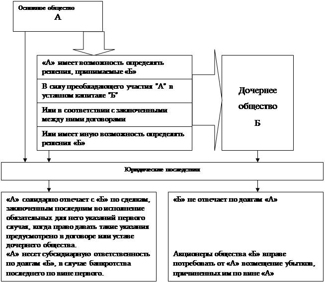 Общество с ограниченной ответственностью имеет, как правило, дочерние и зависимые хозяйственные общества с правами юридического лица, созданные на территории РФ, а также за ее приделами. При этом общество признается дочерним, если другое, основное хозяйственное общество или товарищество в силу преобладающего участия в его уставном капитале, либо в соответствие с заключенным между ними договором, либо иным образом имеет возможность определять решения, принимаемые таким обществом. Дочернее общество не отвечает по долгам основного общества, которое имеет право давать дочернему обществу обязательные для него указания и при этом отвечает солидарно с ним по сделкам, заключенным во исполнение таких указаний.
