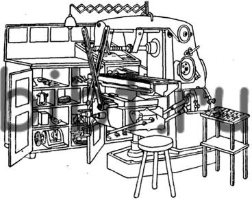 На рисунке 4 приведен пример типовой планировки рабочего места фрезеровщика. На равных расстояниях от фрезерного станка расположены справа - инструментальный шкафчик и слева - ящики или контейнеры для заготовок и обработанных деталей. В ящиках для обработанных деталей предусмотрены перегородки для раздельного хранения точных деталей.