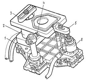 1 — плита, 2, 6 — гидроцилиндры, 3, 5 — прихваты, 4 — упор
