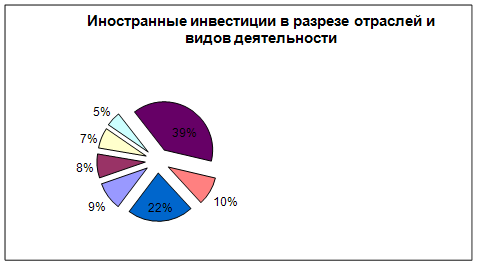 В отраслевом разрезе из диагр. 1 (без учета газопровода «Ямал-Европа») видно, что наибольший удельный вес приходится на инвестиции в деревообрабатывающую промышленность (9,4 %), машиностроение и металлообработку (8 %), пищевую (6,9 %), химическую промышленность (4,9 %). Инвесторов привлекают также торговля и общественное питание (39,2 %), транспортная сфера (9,5 %).