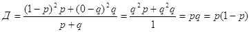 Дисперсия альтернативного признака (т.е. имеющего две взаимоисключающие разновидности, например, пол человека – мужской или женский, качество продукции – годная или бракованная) определяется по формуле 1.25, если вместо Xi подставить 1 и 0 (так как признак может принимать только 2 значения). Зная, что: