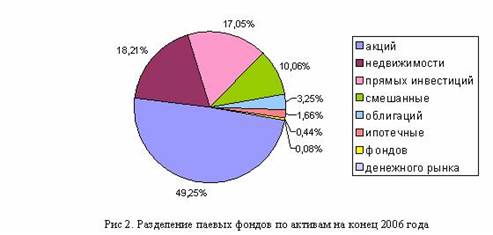 Интервальные фонды сочетают в себе характеристики упомянутых выше ПИФов. Это те фонды, паи которых продаются в заранее установленные промежутки времени. Обычно это делается 4 раза в год, то есть один раз в квартал. Интервал покупки и погашения паев длится две недели. Они являются наименее популярными по стоимости активов (16% рынка на конец 2006 года) и по количеству работающих фондов (86 фондов под управлением 60 различных управляющих компаний) среди ПИФов. Рисунок 1.(12)