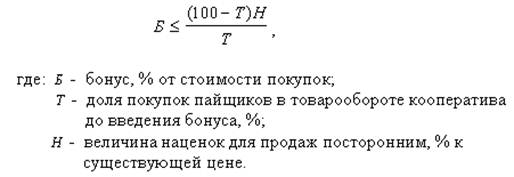 Для применения кооперативных выплат в виде бонуса (премии на товарооборот пайщика) обоснована его величина и соответствующие наценки для продаж посторонним(9).