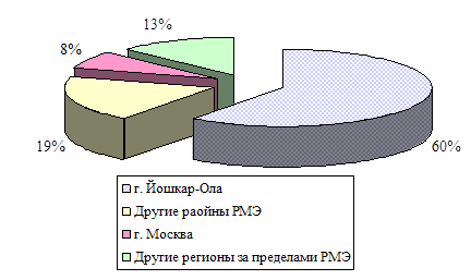 Объем реализации в пределах Республики Марий Эл снижается, это произошло за счет увеличения объемов поставок за пределы республики и расширения основного круга потребителей. Значительную долю в реализации занимают такие регионы, как Татарстан, Чувашия, Москва, а в 2002 г. ещё и Башкирия и Рязанская область. То есть предприятию РООО «Махаон» следует ориентироваться на потребителей республики Марий Эл (особенно г.Йошкар-Олы) и вышеназванных регионов.