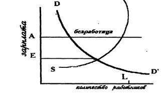 Характерной чертой рынка рабочей силы является постоянное превышение предложения рабочей силы над спросом или наличие безработицы. С рыночной точки зрения это означает, что зара6отная плата находится не в точке равновесия спроса и предложения, а выше. Графически это представляется следующим образом (рис. 1.)(2)