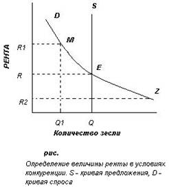 Рисунок показывает, что кривая предложения на землю является фиксированной. Кривые спроса и предложения пересекаются в равновесной точке Е. Рента имеет тенденцию колебаться вокруг этой точки. Если бы рента поднялась выше точки равновесия до точки М, то спрос на землю уменьшился до Q1 и часть земли осталась бы незанятой: Q-Q1. Некоторые земельные собственники были бы не в состоянии сдать ее в аренду, и вынуждены были бы предлагать земельные участки за более низкую плату. По таким же причинам рента не может оставаться долго ниже точки равновесия, например R2. Возросший спрос на земельные участки обусловил бы повышение ренты. Только в точке равновесия общее количество земли, на которую предъявляется спрос, равно ее предложению. В этом смысле предложение и спрос определяют цену земли.