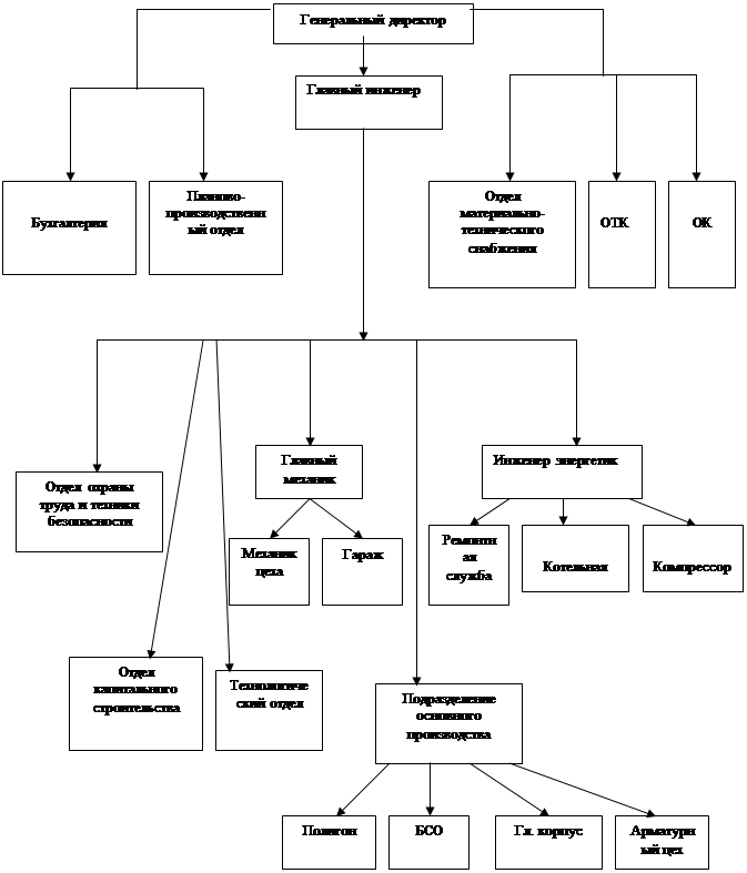 Непосредственно в подчинении у генерального директора находятся: отдел кадров, который занимается наймом и увольнением специалистов и рабочих; бухгалтерия, ОТК – главной задачей является обеспечение качества выпускаемой продукции; планово-производственный отдел занимается разработкой и внедрением мероприятий по повышению качества продукции и выявлению причин брака и его устранению; главный инженер; отдел материально-технического снабжения.