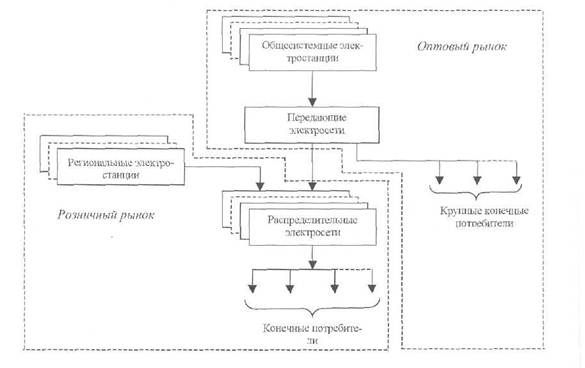 Разделение рынка на оптовый и розничный привело к необходимости создания конкурентной среды между производителями на оптовом рынке. В процессе реформирования электроэнергетики рынок постепенно проходит этапы перехода от регулируемого к дерегулируемому, основанному на естественной конкуренции между производителями электроэнергии. Возникают различные виды взаимоотношений между производителями и оптовыми потребителями электроэнергии, что на данном этапе развития привело к образованию: