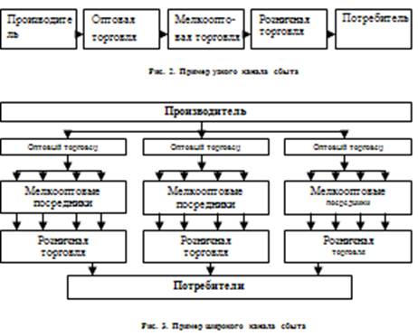 По мере продвижения товара на рынок фирма производитель ищет посредников для дальнейшего распространения продукции и в зависимости от количества посредников, через которых прошел товар канал сбыта может иметь разную длину и ширину.