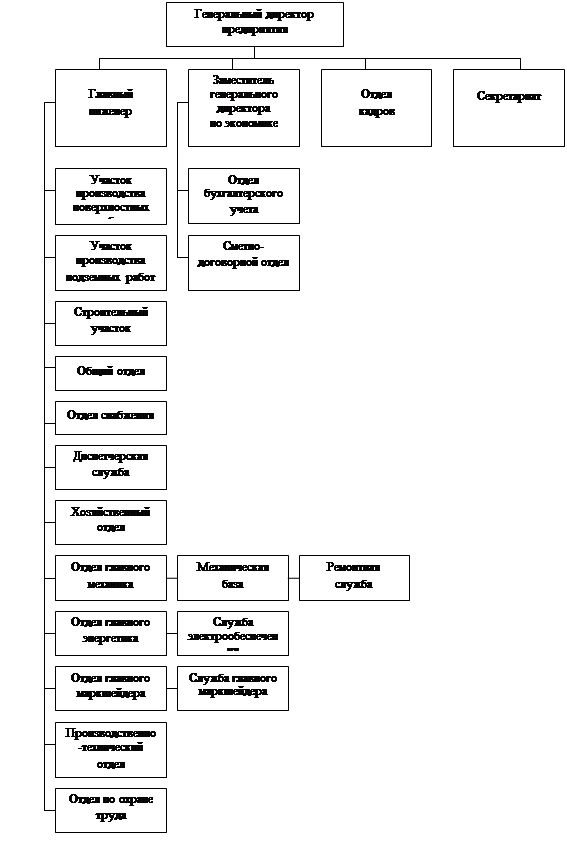 Рассматриваемое предприятие имеет линейную структуру управления. Во главе организации стоит генеральный директор, у которого в подчинении находятся Заместитель генерального директора по экономике, главный инженер, кадровая служба и секретариат. Генеральный директор наделен полномочиями и осуществляет единоличное руководство подчиненными ему подразделениями и сосредоточивающий в своих руках все функции управления. В свою очередь главному инженеру подчинены 12 отделов: Участок производства поверхностных работ, участок производства подземных работ, строительный участок, общий отдел, отдел снабжения, диспетчерская служба, отдел главного механика, главного энергетика, главного маркшейдера, производственно-технический отдел, отдел по охране труда и хозяйственный отдел. В свою очередь отделу главного механика подчинена механическая база, а ей ремонтная служба. Заместителю генерального директора по экономике отданы в подчинение 2 отдела. Это отдел бухгалтерского учета и сметно-договорной отдел.