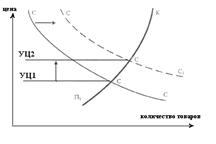 Допустим, что экономика близка к полной занятости и загруженности производственных мощностей. Рост расходов населения, предприятий и государства на потребление смещает кривую совокупного спроса вверх из положения СС в положение СС1 (рис.1). Соответственно, наблюдается и рост цен, положение которых в конечном итоге зафиксируется на уровне УЦ2.