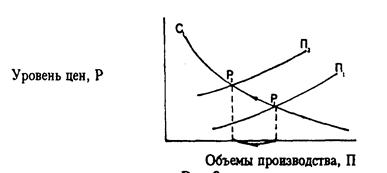 Цены двигаются от P1 к Р2. Здесь действует уже кривая совокупного предложения, вернее ее перемещение вверх. На кривой спроса мы обнаруживаем сокращение, отражающееся соответственно и на горизонтали реального объема производства. На него влияют не только произошедшее уже удорожание факторов производства, но и, что не менее важно, ожидаемое.