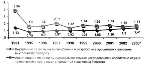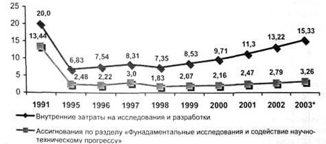• меры финансовой поддержки научной, научно-технической и инновационной деятельности. Итоги финансирования за десятилетний период в относительных единицах доли ВВП и расходной части бюджета приведены на рис.1 и в абсолютных единицах в сопоставимых ценах — на рис. 2. Более крутой наклон на втором рисунке говорит о том, что экономика растет быстрее, чем бюджетные затраты на науку. И это хорошо, потому что только на бюджетные затраты ориентироваться просто невозможно. Перспектива определена Президентом РФ в «Основах...» (в частности, бюджетный рост науки — 06 раздел бюджетной классификации — с 39,9 до 46,0 млрд. руб. с 2003 до 2004 г).