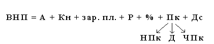 Различают два вида доходов: трудовые и на собственность (предпринимательский). Основную часть трудовых доходов составляет заработная плата. Предпринимательские доходы включают: ренту (Р), доходы от собственного (частного) предприятия (Дс), прибыль корпораций (Пк), включающая налог на прибыль корпораций (НПк), чистую прибыль (ЧПк), дивиденды (Д); проценты по вкладам (%). По данному методу расчета учитываются два компонента, не относящиеся к выплатам: амортизация (А) – износ капитала и косвенные налоги (Кн = таможенные пошлины, налоги с продаж, НДС).