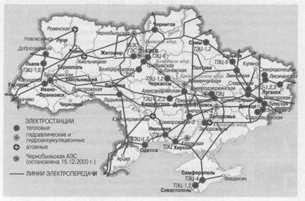 Основные тепловые электростанции сосредоточены в Донбассе.Среди них крупнейшими являются Углегорская- 3,6 млн кВт, Мироновская,Луганская, Старобешевская— по 2,4 млн кВт каждая, Зуевскаяи Зуевская-2,Славянская, Кураховская, Штеровская.Здесь же функционирует мощная линия электропередачи Донбасс — западные области Украины.