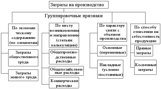 Необходимость изучения структуры себестоимости обусловлена тем, что затраты предприятия на производство продукции различны по своей экономической природе и величине, а следовательно, и по удельному весу в полной себестоимости. В связи с многообразием издержек производства их принято группировать по различным признакам в качественно однородные совокупности (рис.1).
