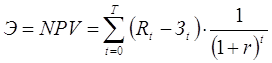 Чистый дисконтированный доход NPV определяется как сумма текущих эффектов за весь расчетный период, приведенная к начальному шагу, или как превышение интегральных результатов над интегральными затратами. Величина NPV для постоянной нормы дисконта (Е) вычисляется по формуле: