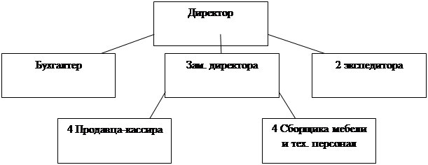Численность работающих 14 человек: 1 – директор, 1– зам. директора, 1 - бухгалтер, 2 – экспедитора, 4 – продавцов-кассиров, 4 – грузчика (они же являются сборщиками мебели), 1 – технический персонал.