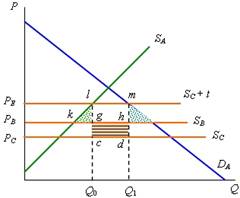 Частичный анализ. На рис. 1. линии SA и DA представляют предложение и спрос на некоторое благо в стране А, а линии SB и SC совершенно эластичное по цене предложение на этом же рынке стран В и С.(7)
