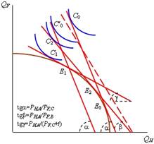 , а структуры производства и потребления представляют соответственно точки E2 и С2. Поскольку РF,C < РF,B, то tg
