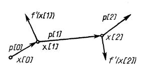 Геометрический смысл метода сопряженных градиентов состоит в следующем (Рис. 2.11). Из заданной начальной точки х(0) осуществляется спуск в направлении р(0) = -f'(x(0)). В точке х(1) определяется вектор-градиент f'(x (1)). Поскольку х(1) является точкой минимума функции в направлении р(0), то f’(х(1)) ортогонален вектору р(0). Затем отыскивается вектор р (1), H-сопряженный к р (0) . Далее отыскивается минимум функции вдоль направления р(1) и т. д.