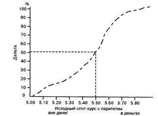 Пример. Дельта 0,65 по опциону "колл" ф.ст./доллар на сумму 50 000 фунтов равняется эквивалентной позиции 32 500 фунтов на спото-вом рынке.