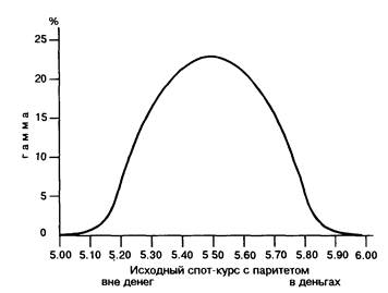 Таким образом, гамма приближается к нулю для опционов, которые очень "вне денег" или "в деньгах". Гамма (или ее абсолютная величина в случае, когда она отрицательна) имеет максимальную величину для опционов "с паритетом".