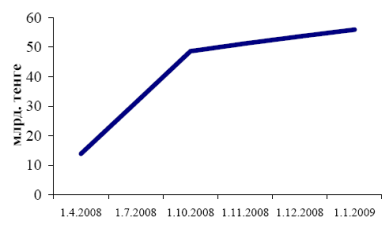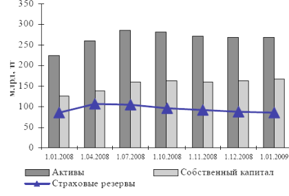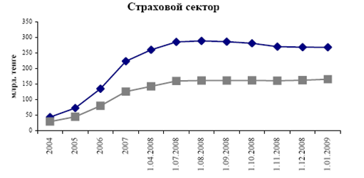 За 2008 год совокупные активы страховых организаций увеличились на 20,2%, составив на 1 января 2009 года 268,81 млрд. тенге, уменьшившись за декабрь на 0,3 млрд. тенге или 0,1%. Совокупный собственный капитал увеличился на 31,4% и составил 165,9 млрд. тенге, увеличение за месяц составило 3,1 млрд. тенге или 1,9%. Сумма страховых резервов составила 86,3 млрд. тенге.